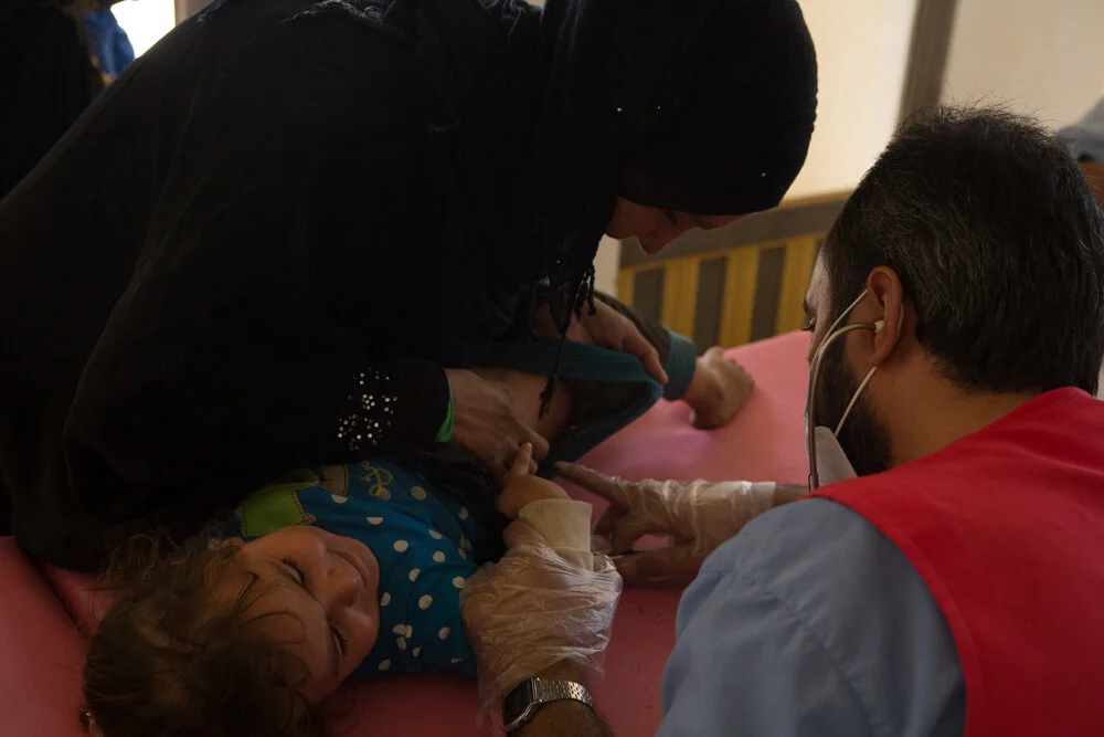 Medicine on the move. Residents of the village of al-Khalaya wait their turn at the mobile clinic, which stops by for three or four hours a week and sometimes sees as many as 100 patients in a visit. For many of the village’s estimated 6,000 people, this is their only chance to access free healthcare, as they can’t afford the 30 kilometre drive to Raqqa. In addition to visiting the villages outside Raqqa, mobile clinics also stop in rural areas of Hassakeh and Deir Ezzor provinces.